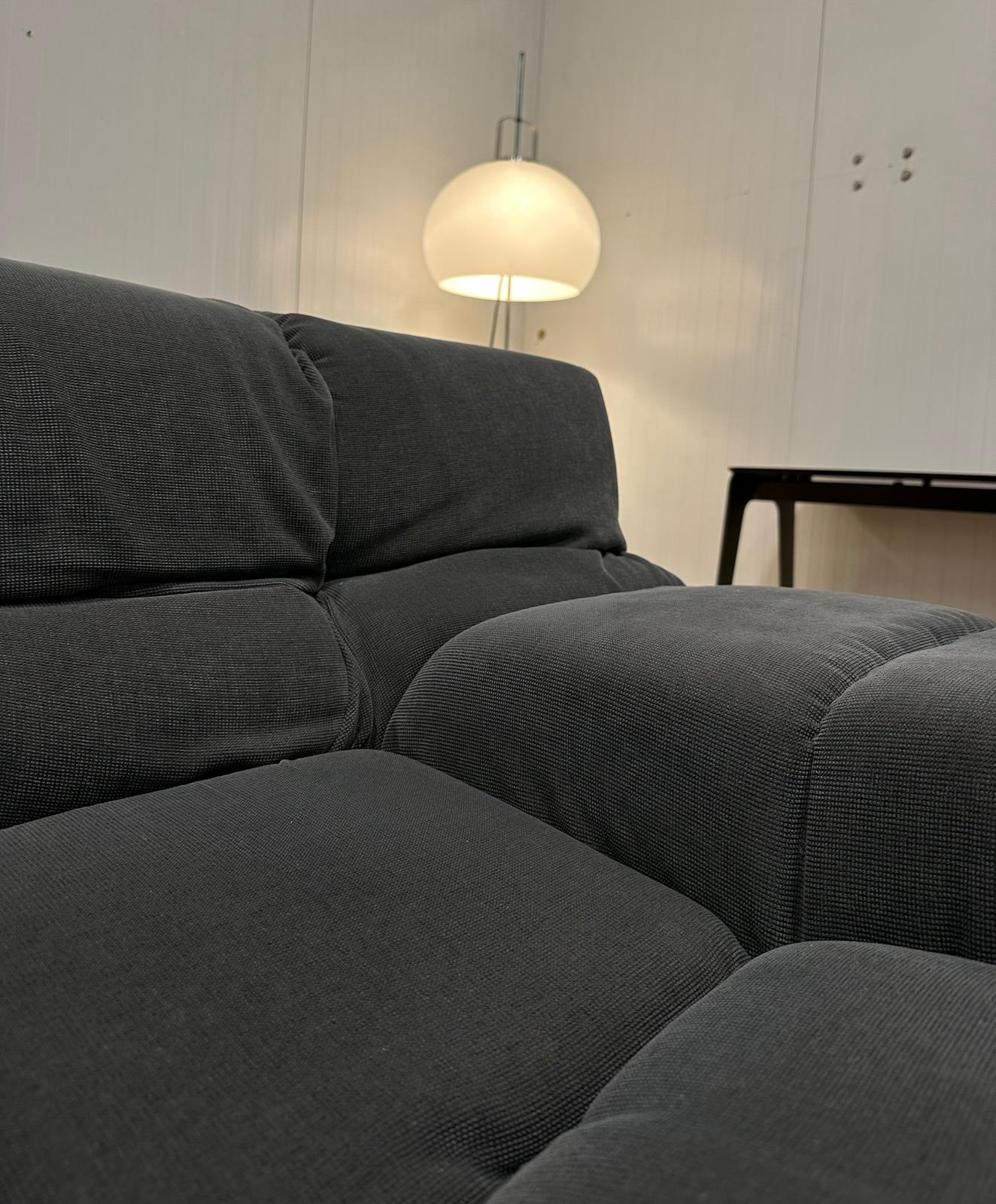 Comfortabele B&B Italia Tufty Time 4/5-zits bank, uitgevoerd in de originele donkergrijze stof. Dit iconische model staat bekend om zijn diepe zit en nonchalante loungecomfort.
