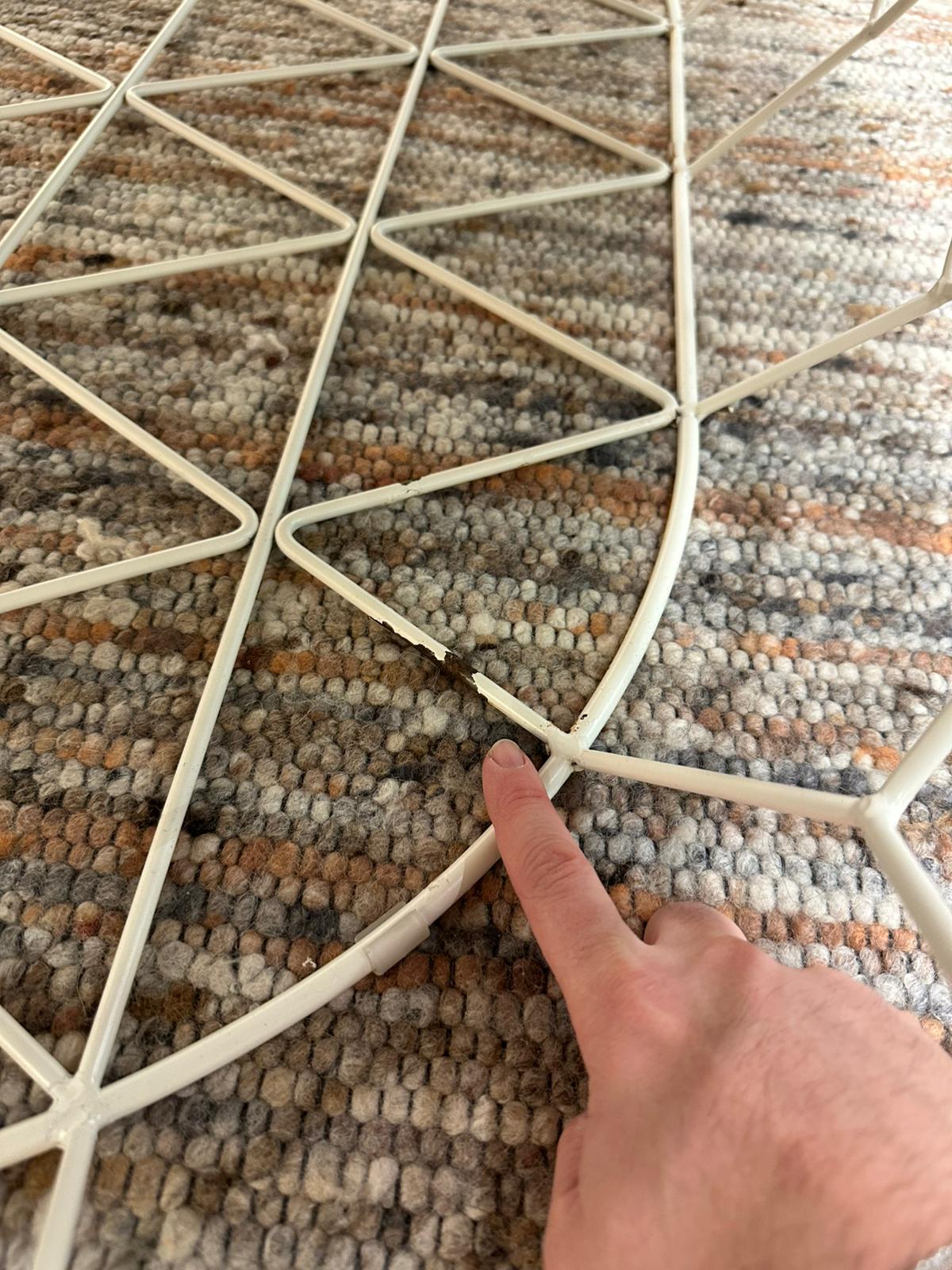 De tafel verkeert in zeer nette staat. Er zijn minimale gebruikssporen zichtbaar aan de onderzijde van het metalen frame, waar plaatselijk wat lak is verdwenen. Dit is niet zichtbaar in normaal gebruik.