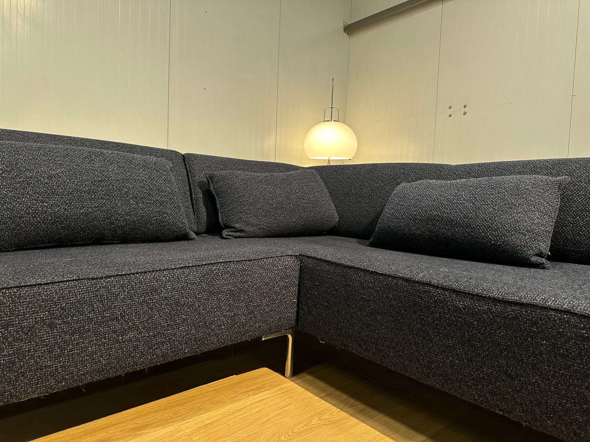 Prachtige Design on Stock Bloq XXL hoekbank uitgevoerd in een luxe donkerblauwe stof.