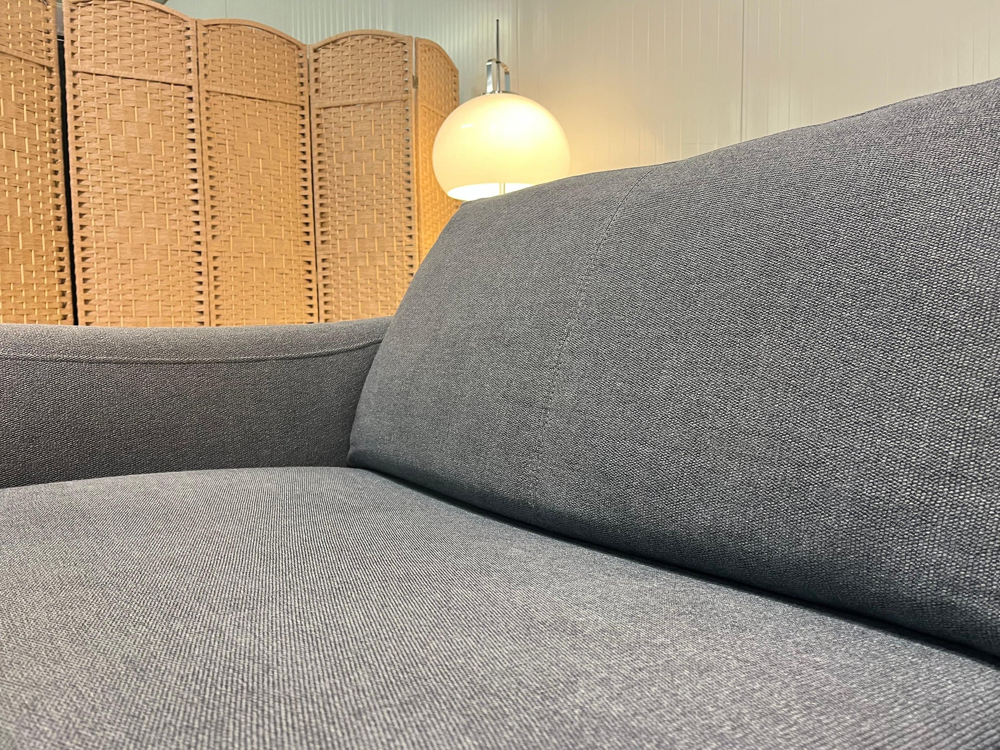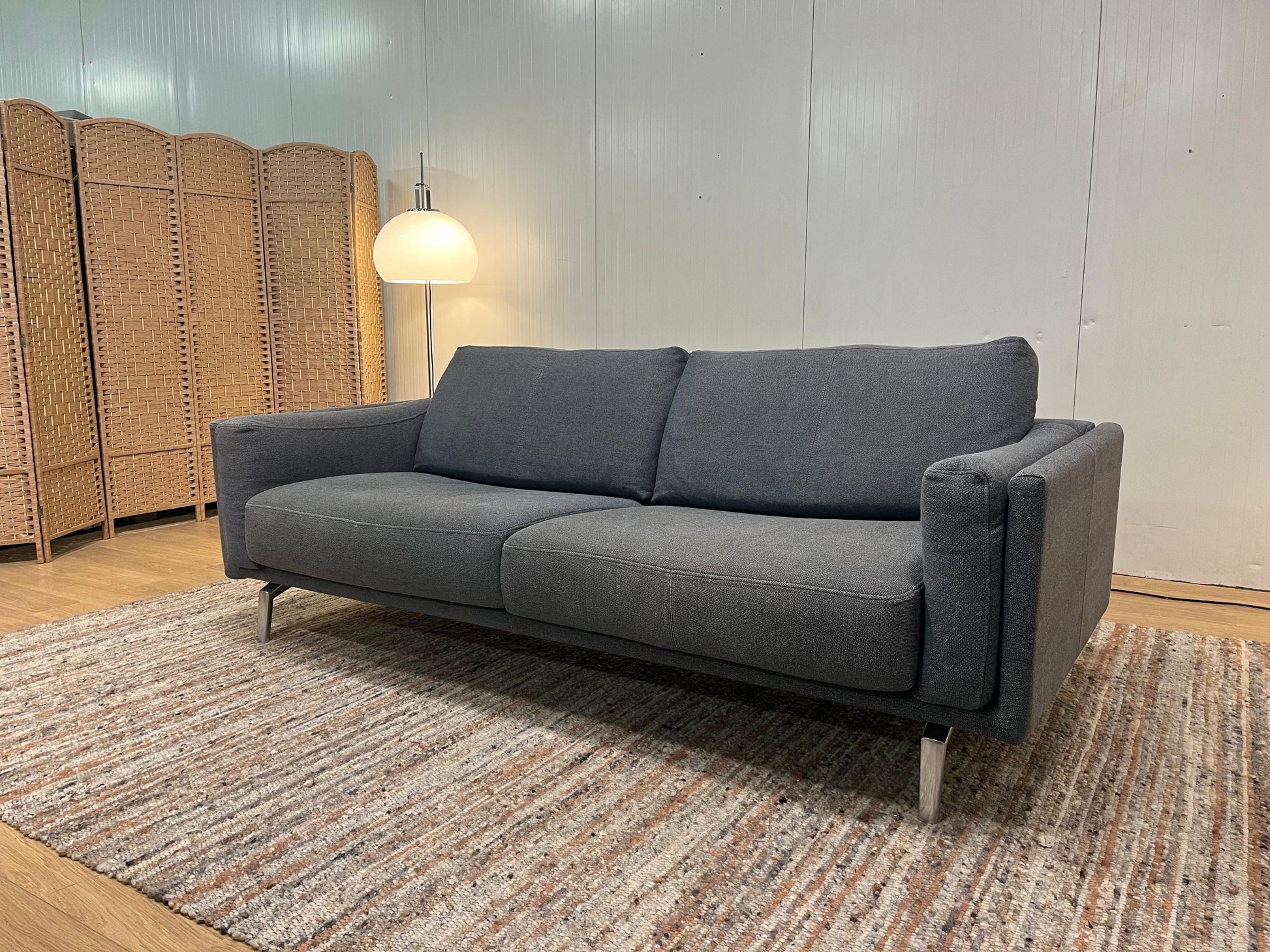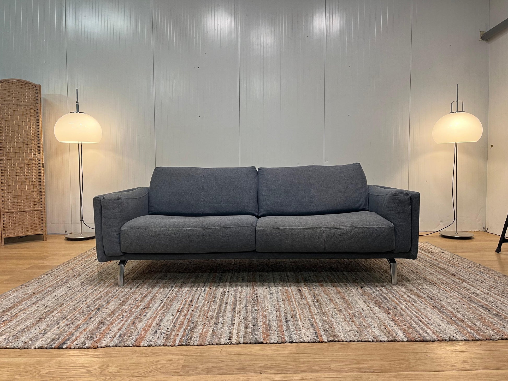 Stijlvolle Leolux Bellice 3-zits bank, uitgevoerd in een luxe grijsblauw gemĆŖleerde wollen stof.