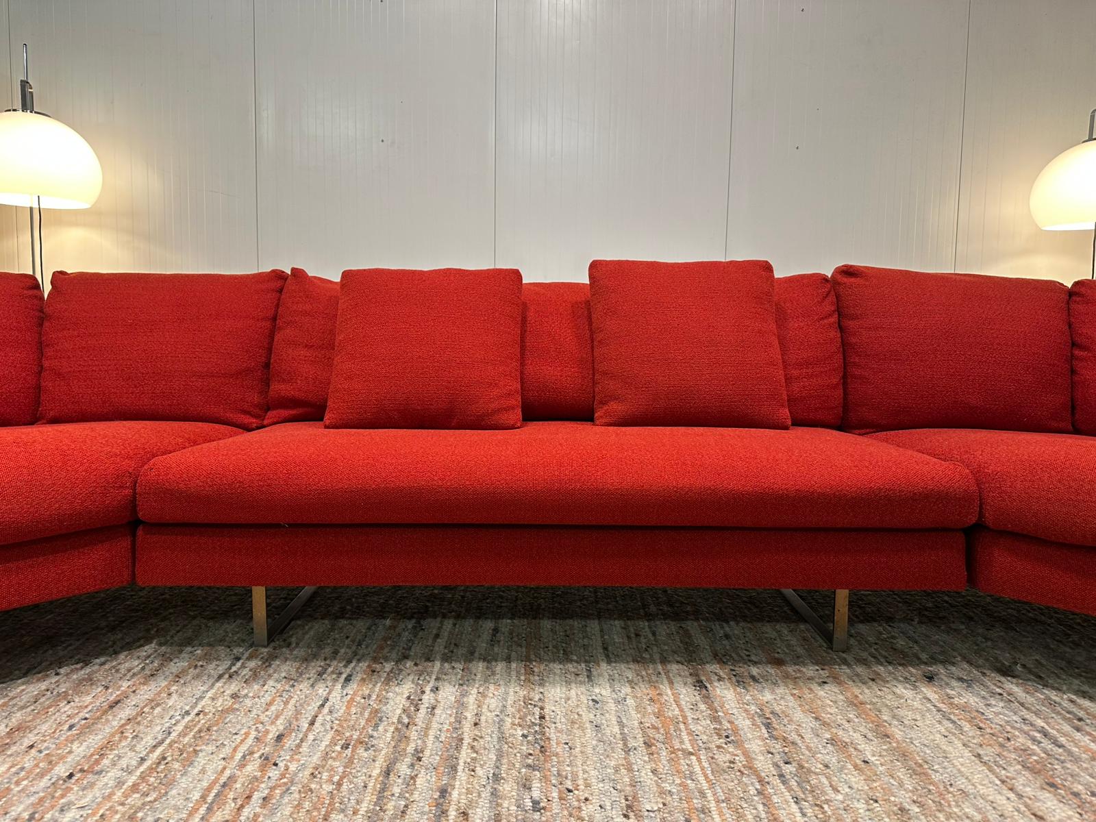 Modulaire Montis Axel hoekbank uitgevoerd in een rode stof. Dankzij het modulaire systeem is de bank flexibel op te stellen en geschikt voor grote woonruimtes. De bank zit comfortabel en heeft een krachtige, moderne uitstraling.