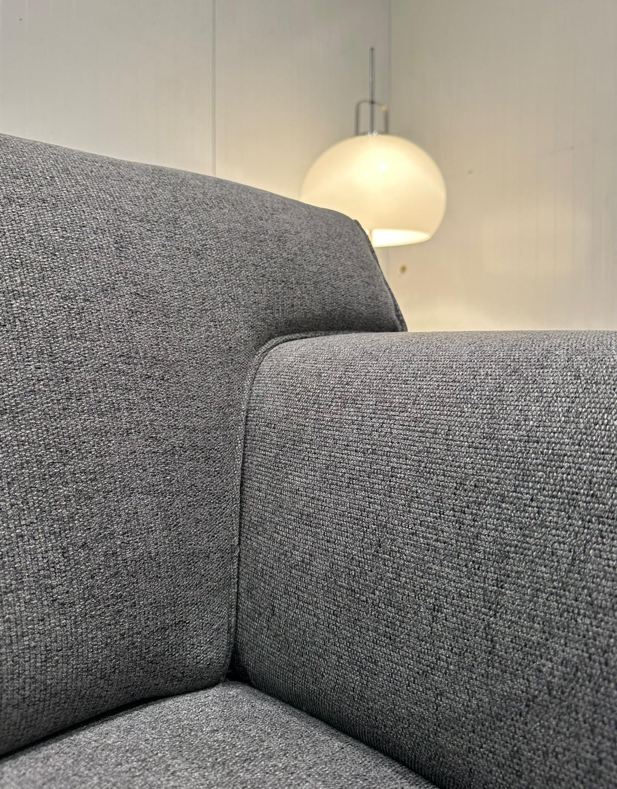 Prachtige Design on Stock 3-zitsbank, volledig nieuw gestoffeerd in een tijdloze grijze stof.