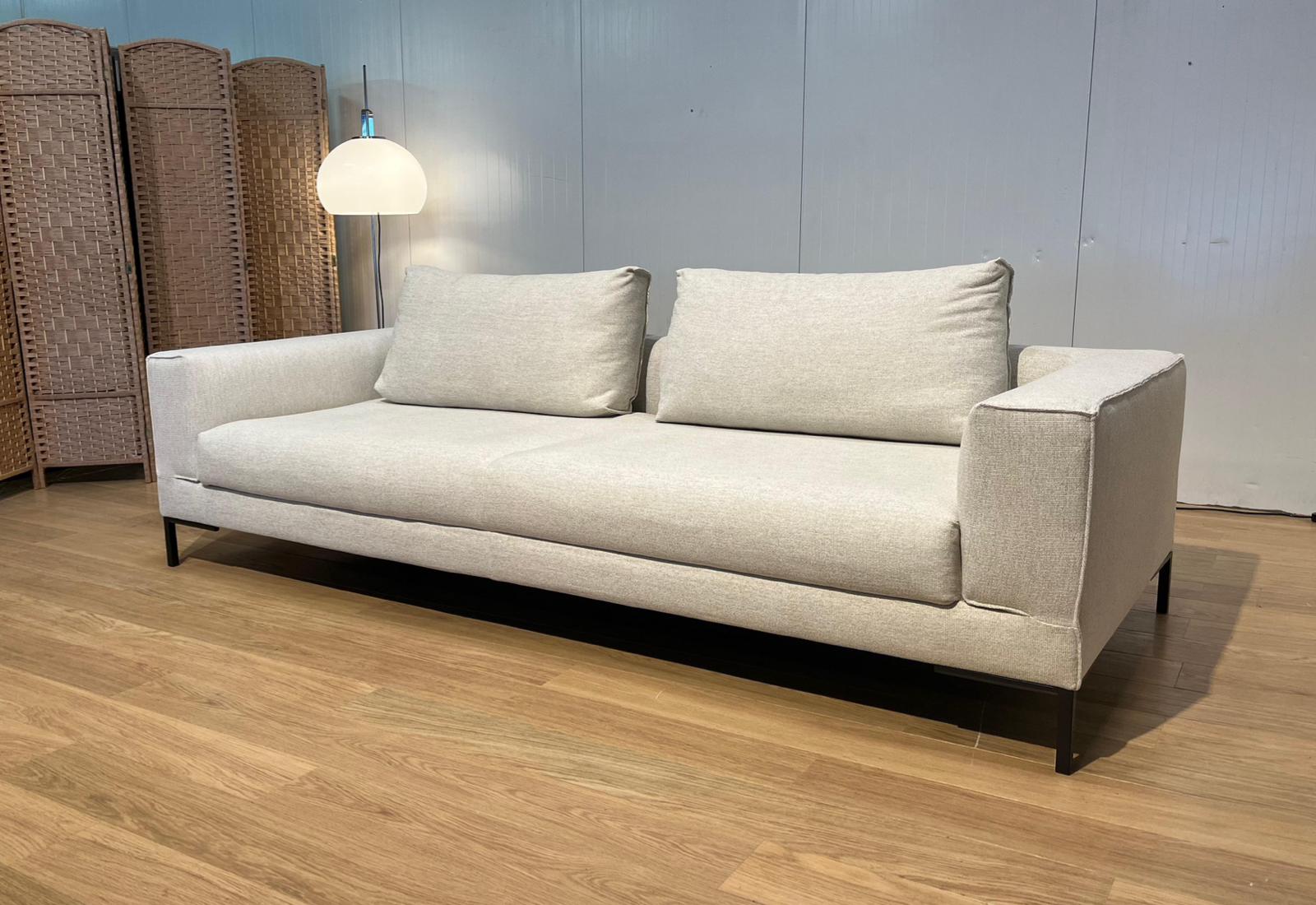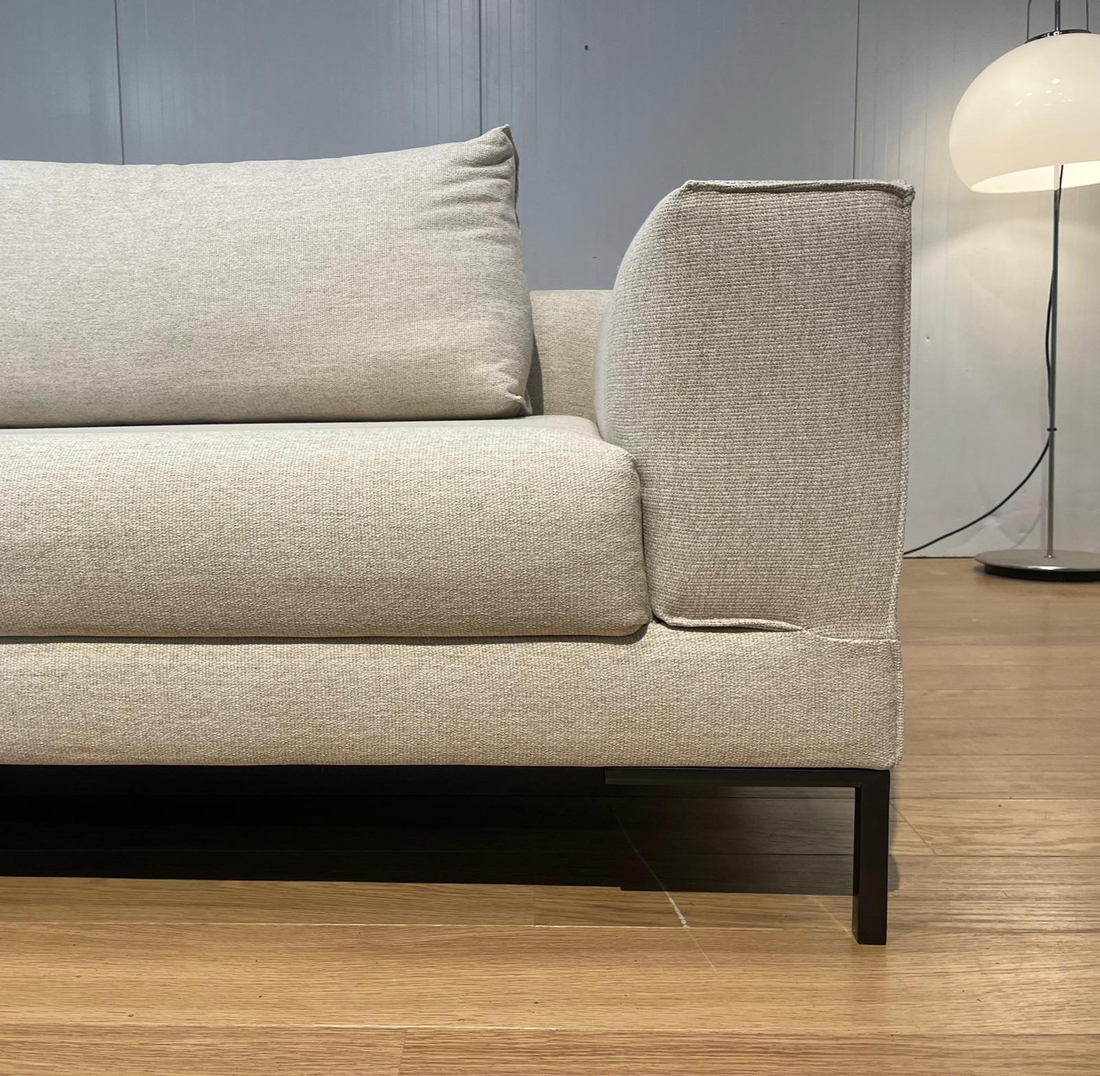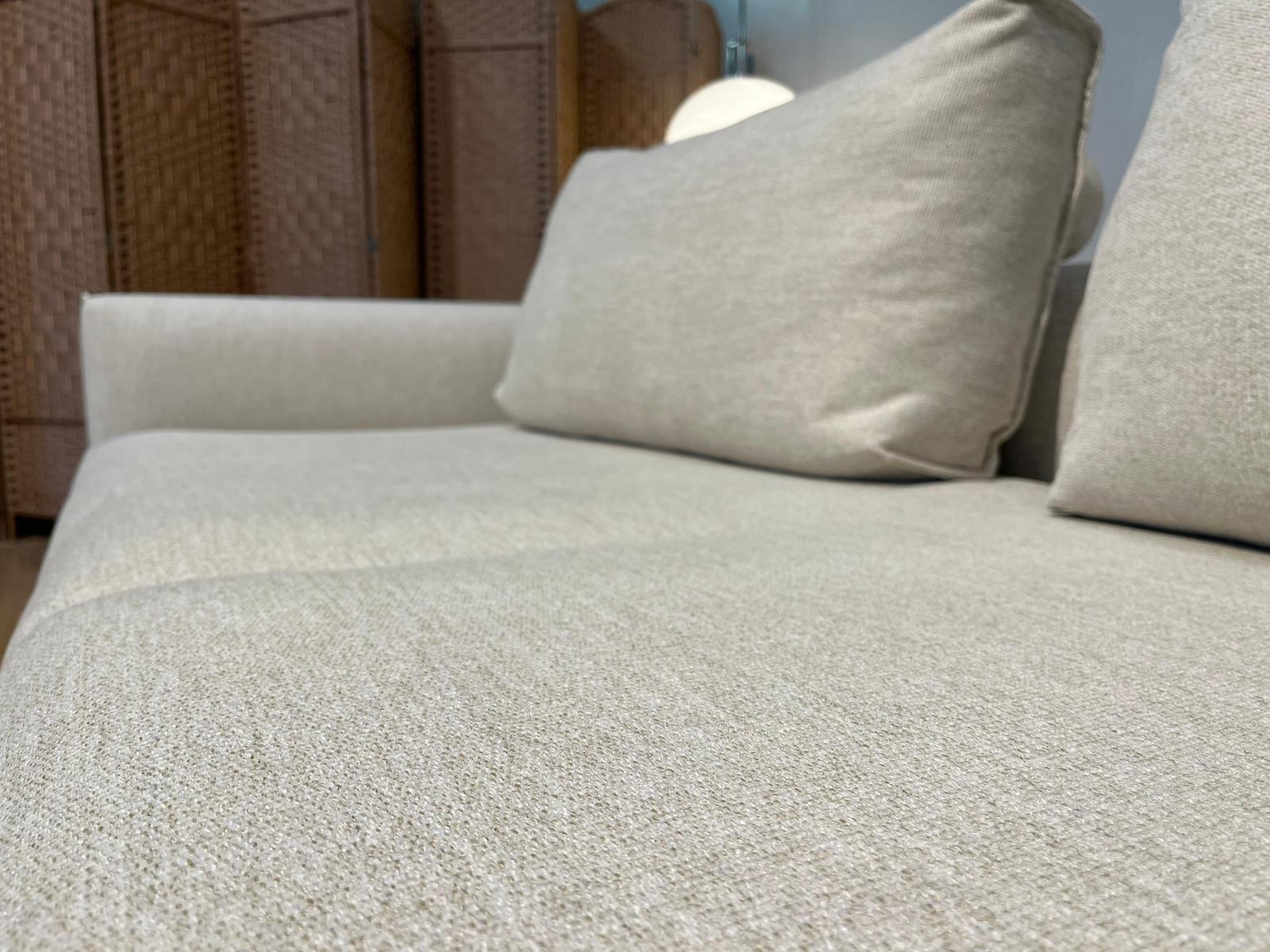 Prachtige Design on Stock Aikon Lounge 4-zits bank, nieuw gestoffeerd in een stijlvolle ecru tint. Deze bank combineert een strak, tijdloos ontwerp met een comfortabel lounge-zitcomfort. De stoffering is sterk, slijtvast en makkelijk schoon te houden, waardoor de bank perfect is voor dagelijks gebruik.