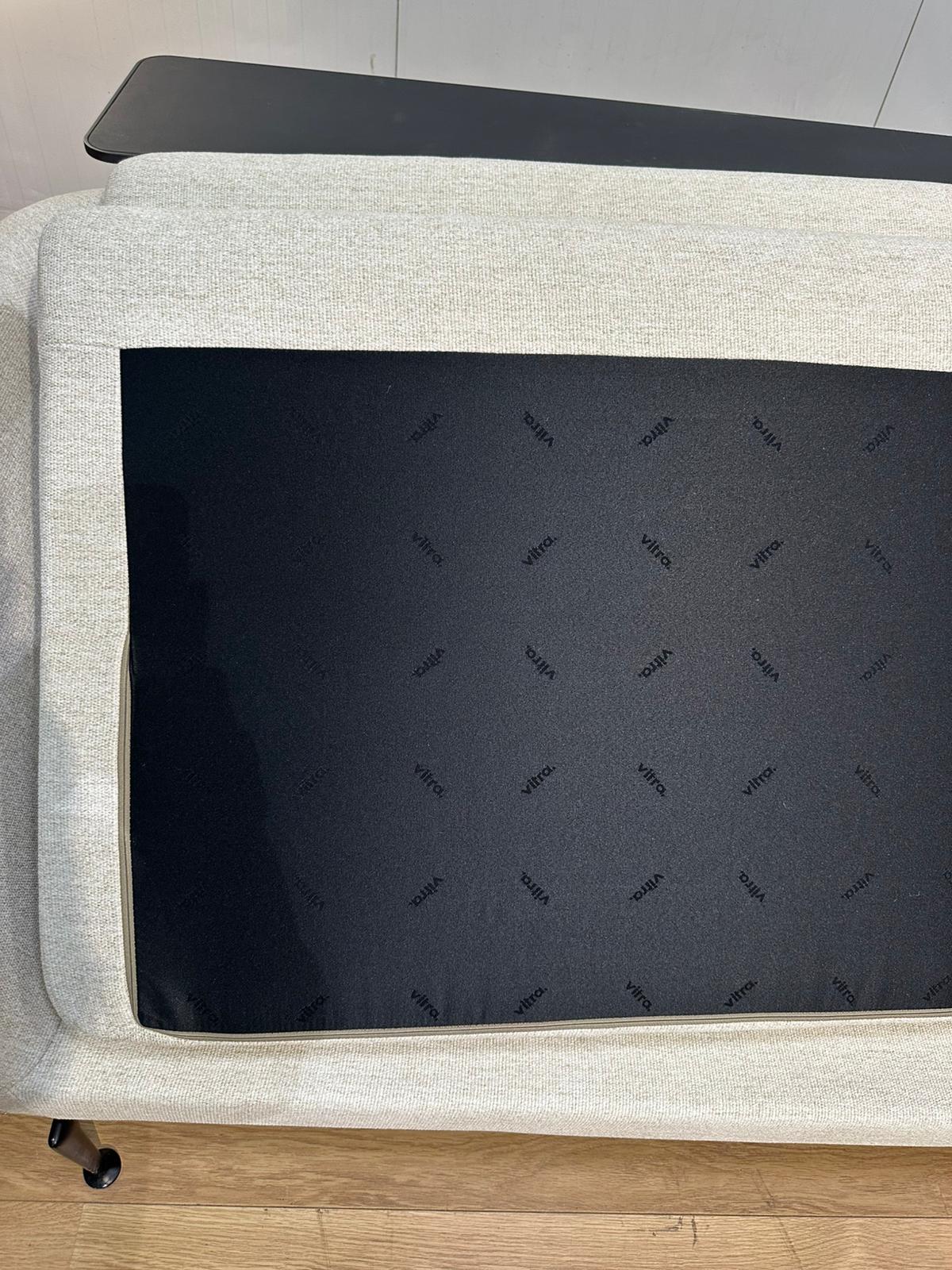 De bank is opnieuw opgebouwd, voorzien van zware kwaliteit matzwarte poten en wordt geleverd met de bijpassende grote matzwarte Vitra Plate Table.
