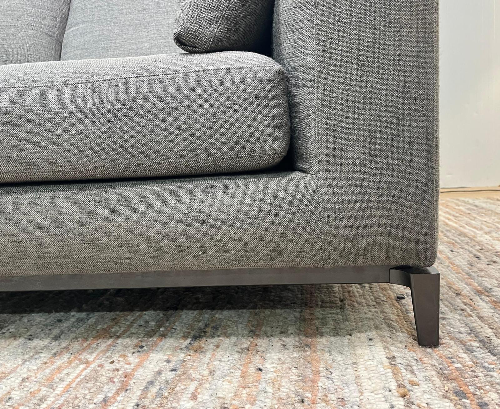 Prachtige Minotti Andersen 2-zits bank uitgevoerd in de originele grijze stof. De bank verkeert in absolute nieuwstaat, is professioneel gereinigd en afkomstig uit een rookvrije en diervrije omgeving. Compact, stijlvol en voorzien van het bekende comfortabele zitcomfort waar Minotti om bekend staat.