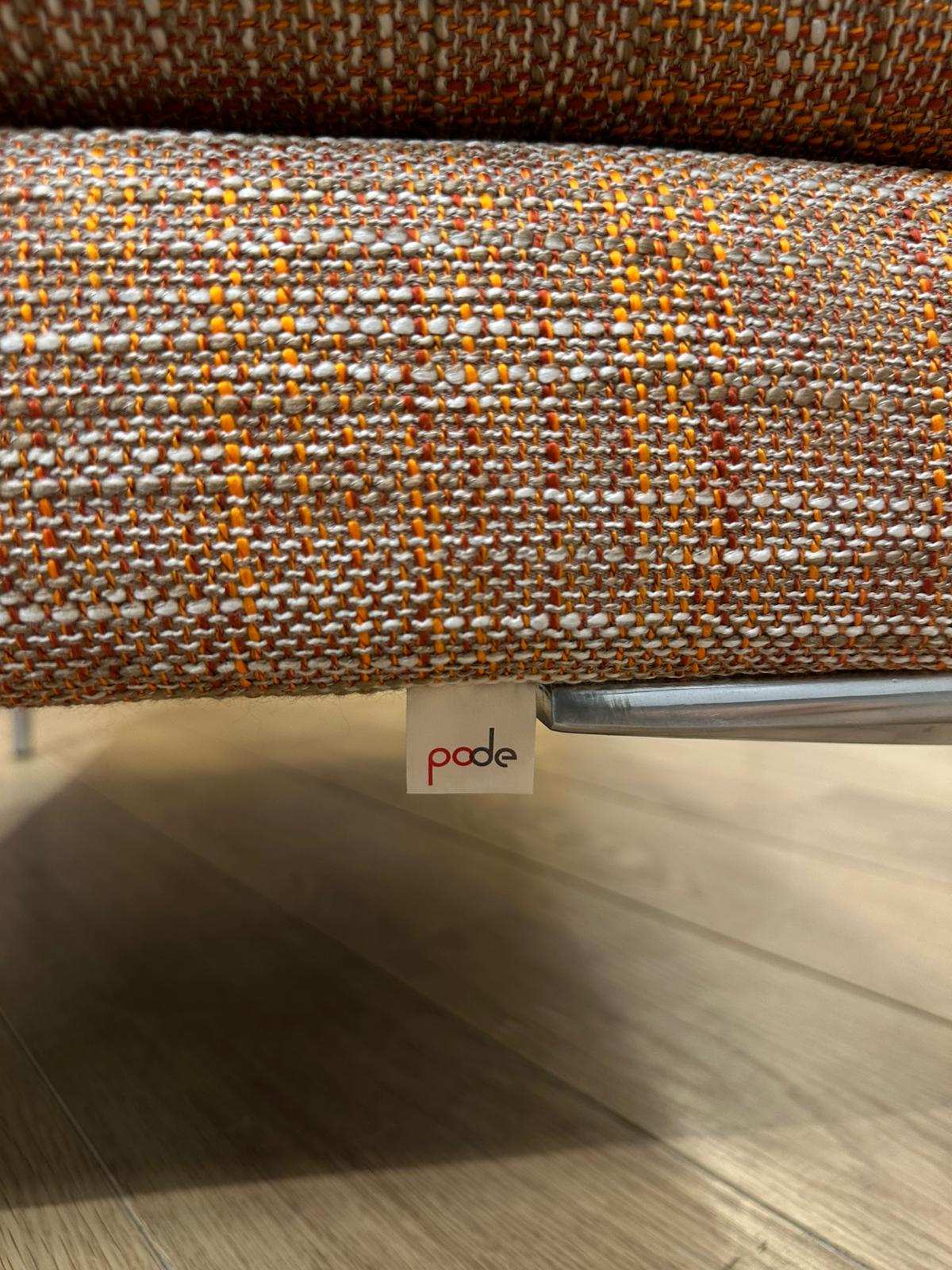 Prachtige Pode Fold hocker uitgevoerd in een oranje gemêleerde stof, inclusief 2 originele Pode sierkussens. De hocker verkeert in absolute nieuwstaat, is professioneel gereinigd en afkomstig uit een rookvrije en diervrije omgeving. Perfect als aanvulling op een Pode Fold bank, maar ook los een stijlvolle en comfortabele eyecatcher.