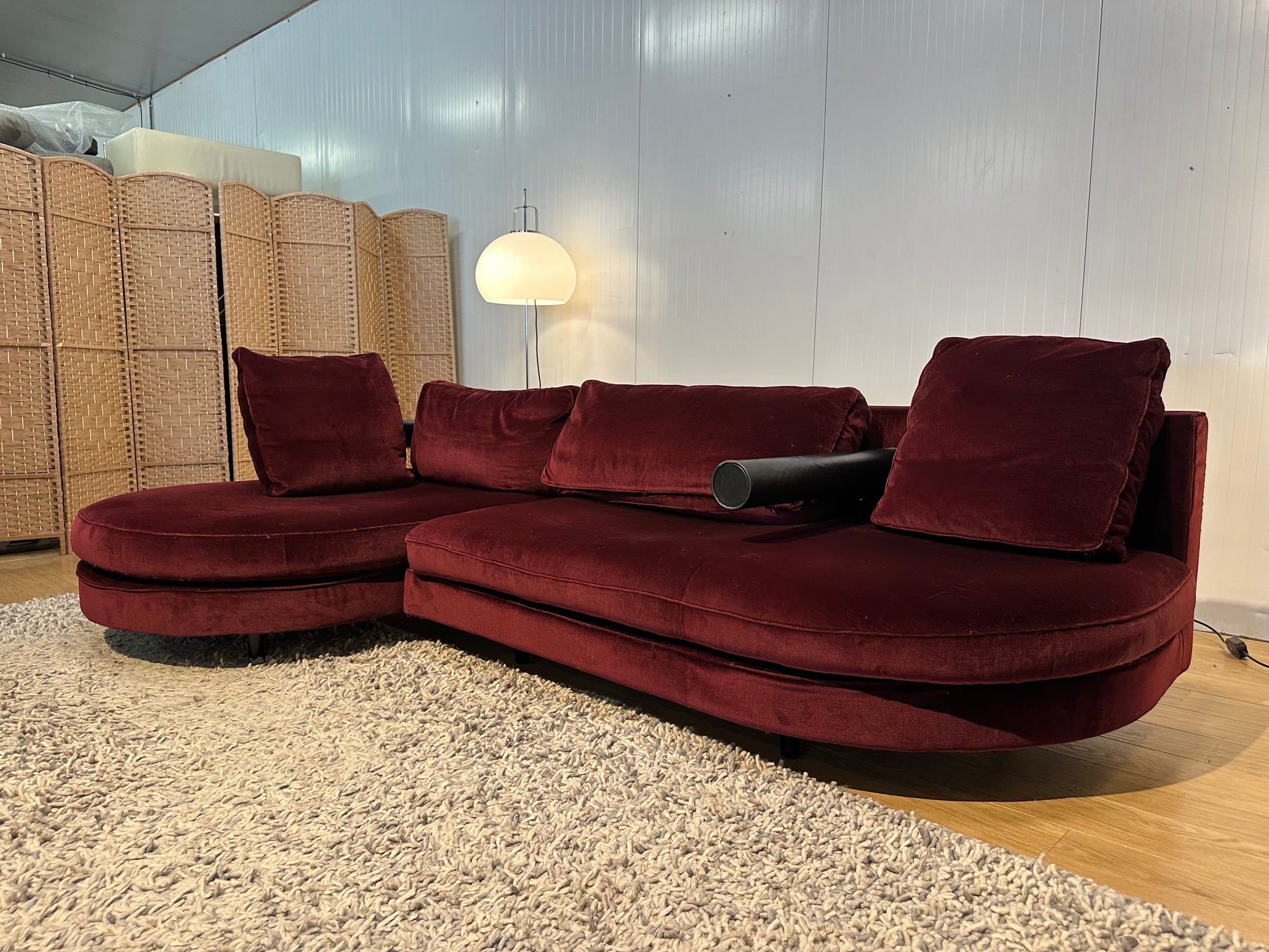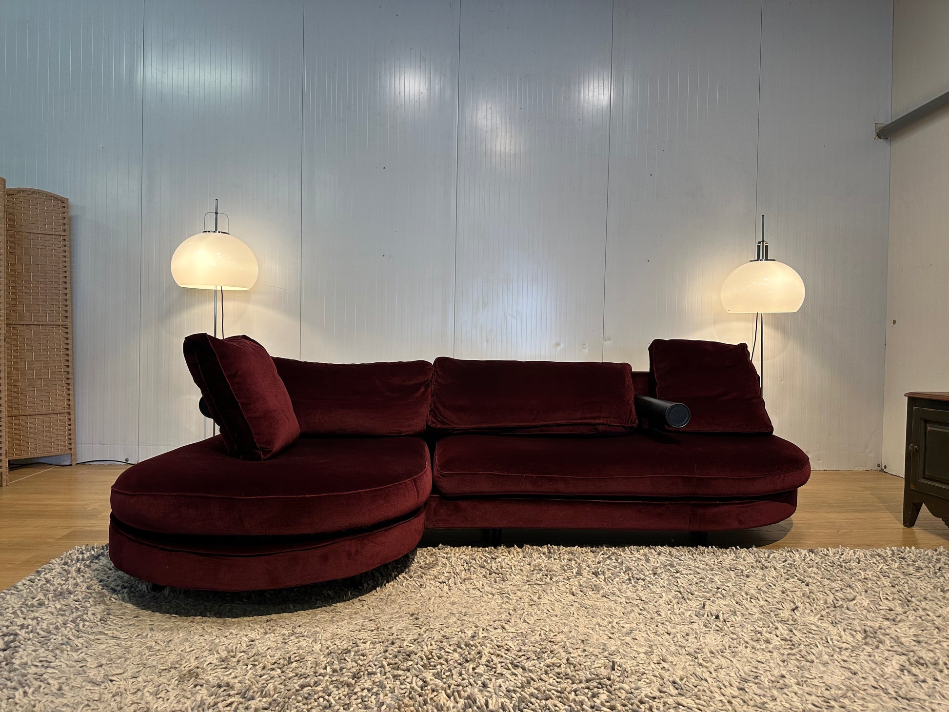 Zeldzame Sitty hoekbank van B&B Italia, ontworpen door Antonio Citterio. Uitgevoerd in opvallend rood velvet suède en voorzien van het iconische afgeronde zitontwerp uit de jaren ’90. Deze designklassieker combineert sculpturale vormen met luxe zitcomfort en is een echte eyecatcher voor liefhebbers van Italiaans topdesign.