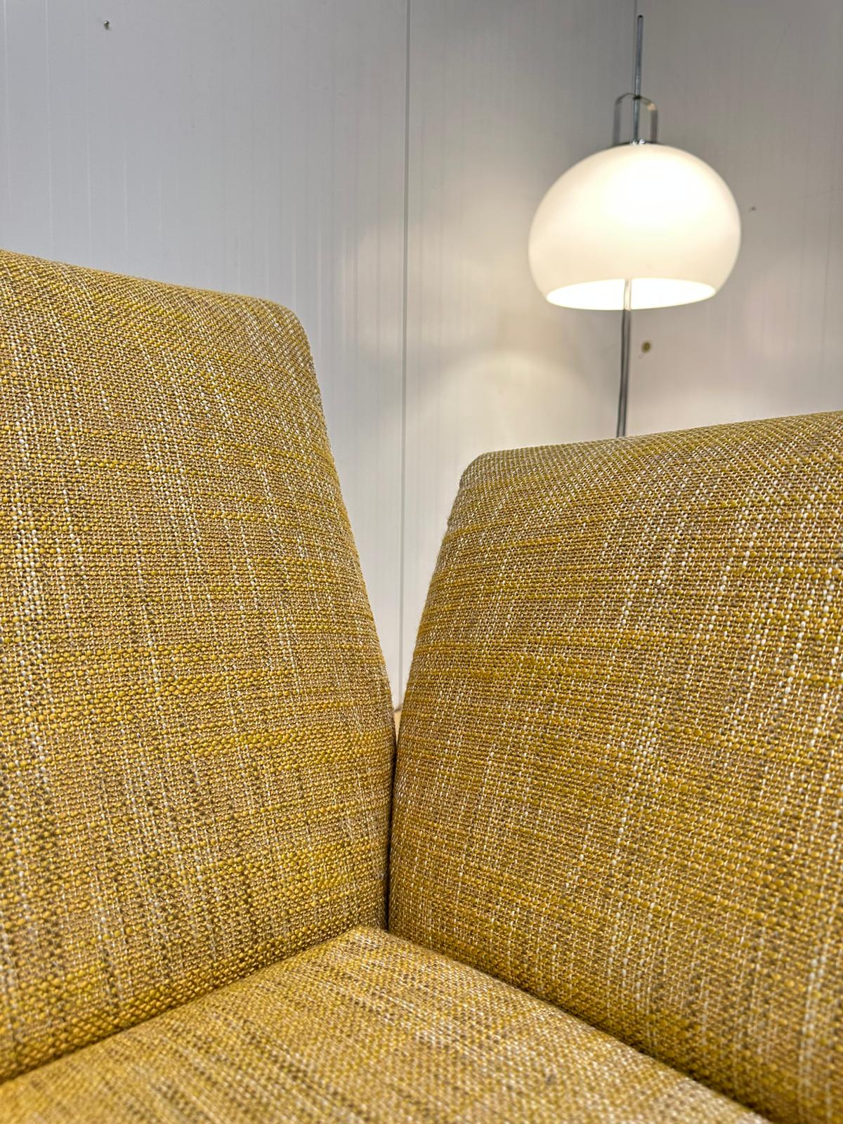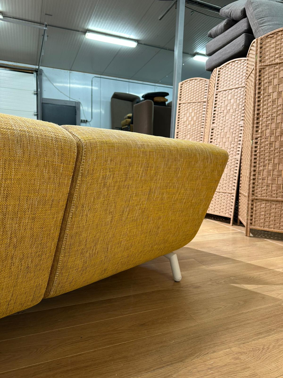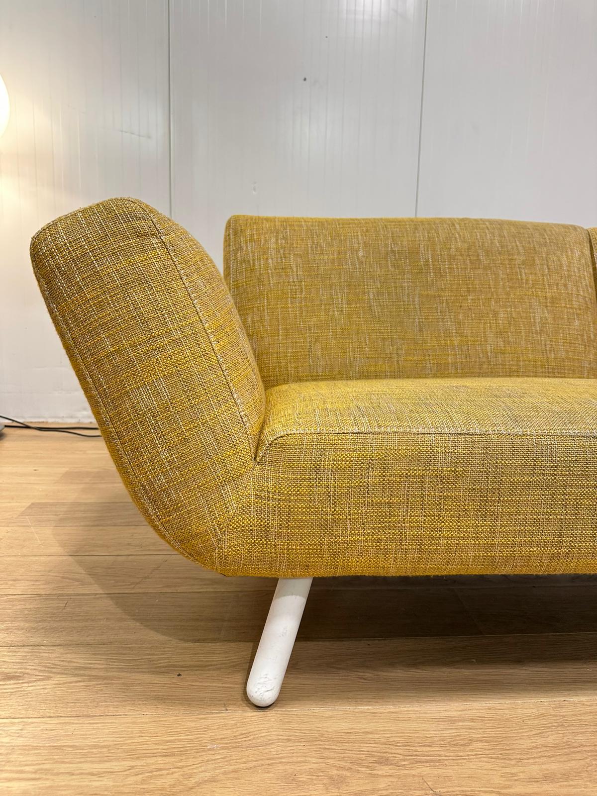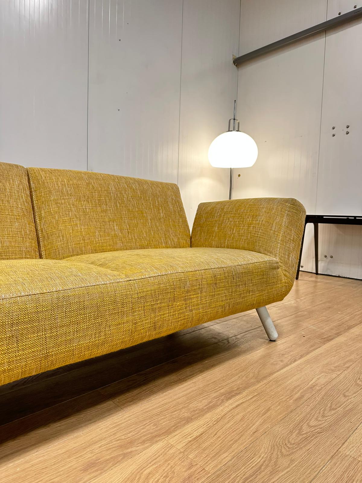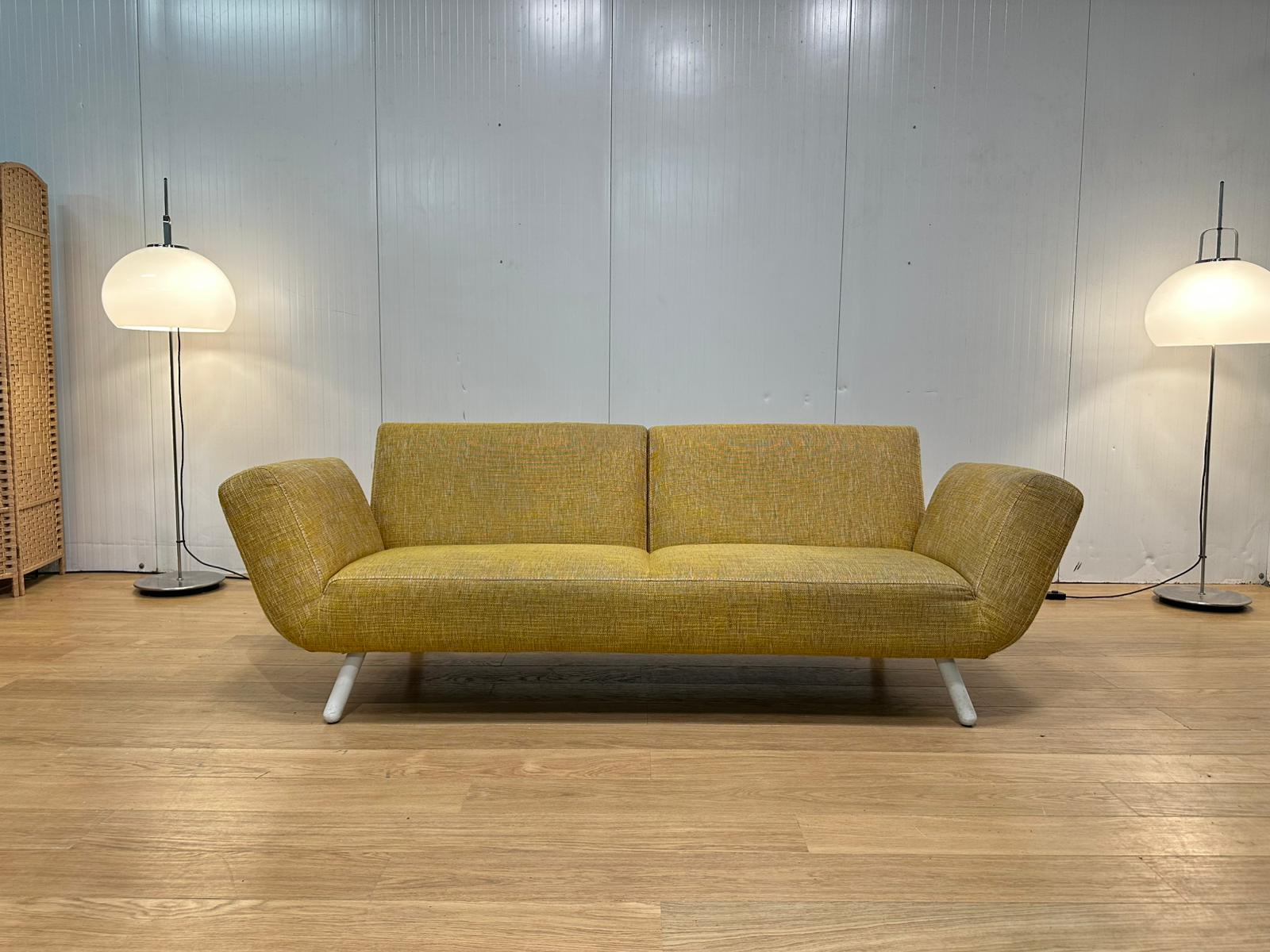 Stijlvolle Pode Dr’op 3-zits designbank uitgevoerd in een opvallende gele stof. Deze bank staat bekend om zijn verstelbare arm- en rugleuningen, waardoor u het zitcomfort eenvoudig aanpast van actief zitten tot ontspannen loungen. De bank verkeert in zeer goede staat, is professioneel gereinigd en komt uit een rookvrije en diervrije omgeving.